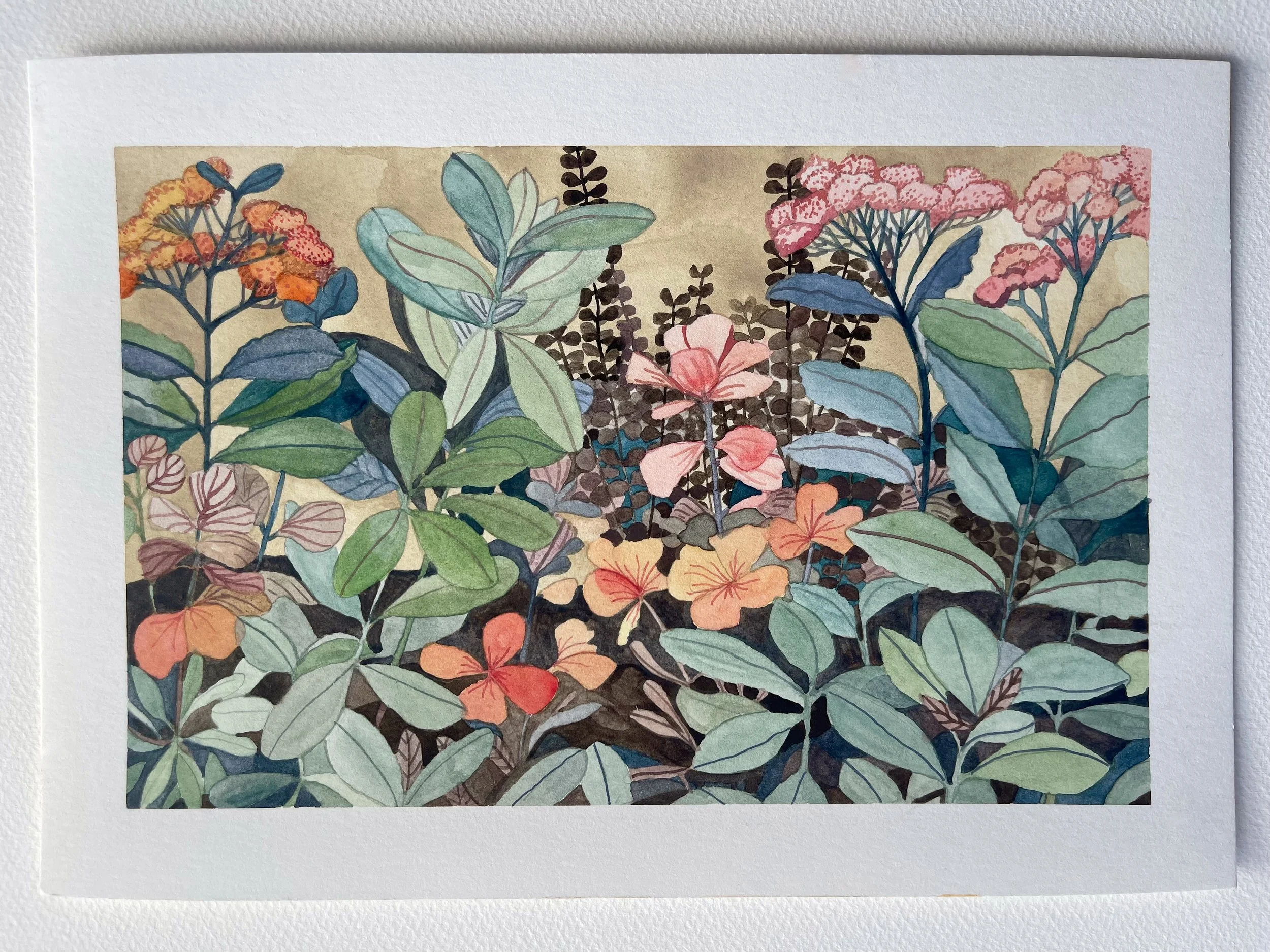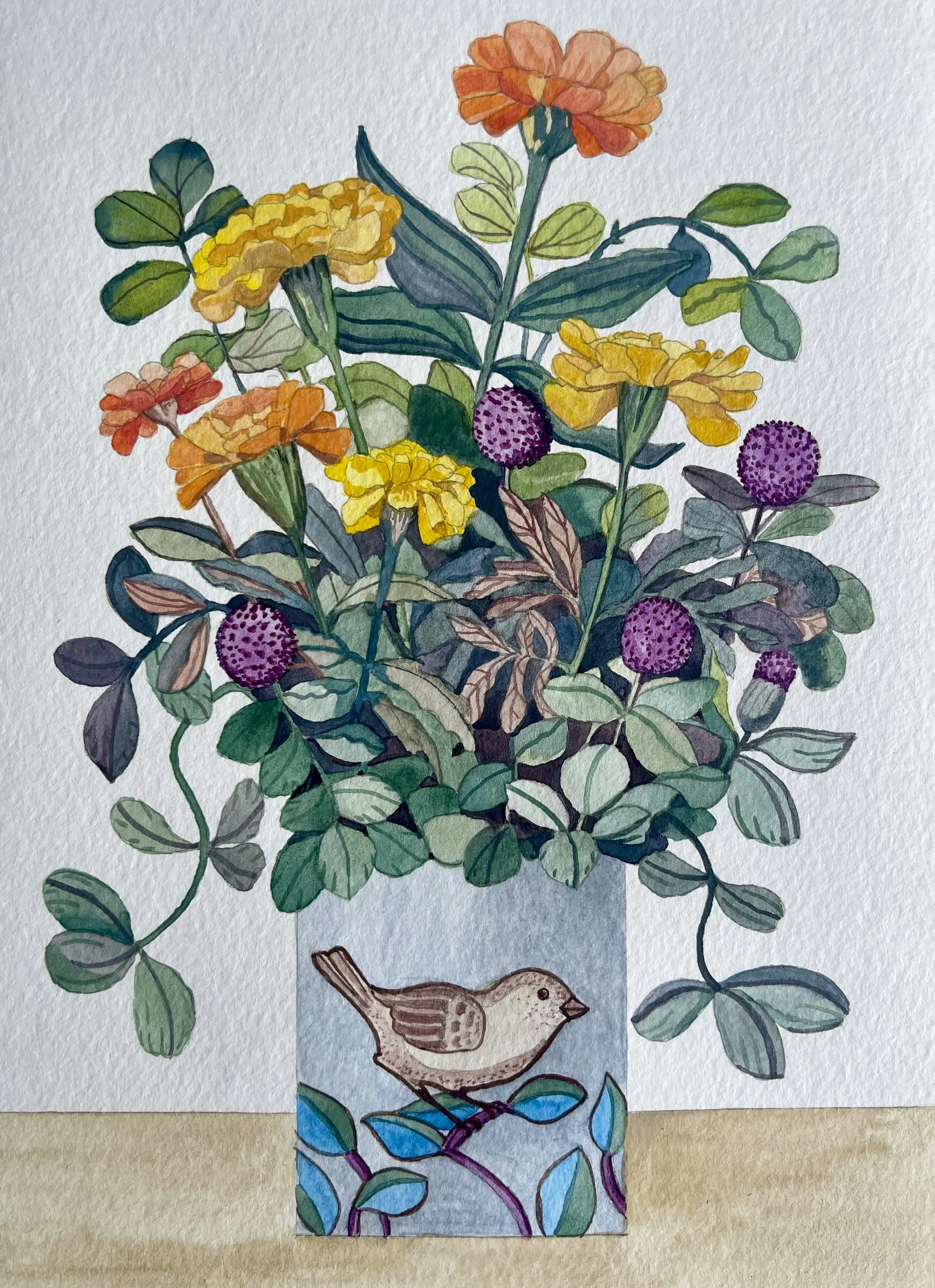 Marigolds and clover, watercolour on paper, 15 x 21cm.